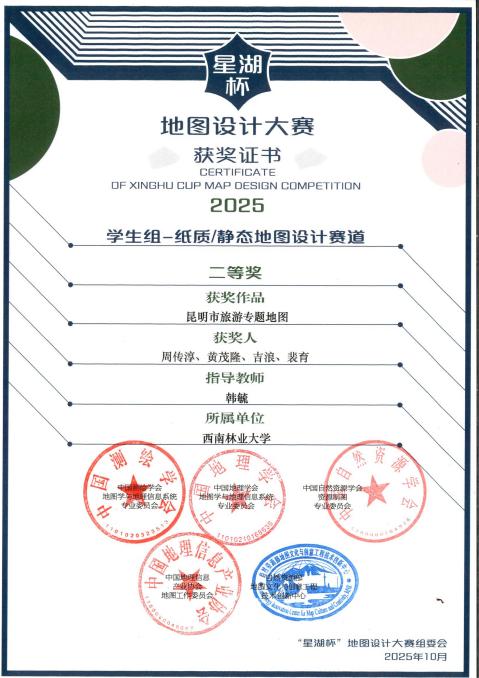 近日,第二届“星湖杯”全国地图设计大赛获奖名单正式公布。由太阳集团tyc151韩毓老师指导,员工周传淳、黄茂隆、吉浪、裴育共同完成的作品《昆明市旅游专题地图》,凭借其创新的设计理念与扎实的专业技术,在员工组纸质/静态地图设计赛道中荣获全国二等奖。“星湖杯”大赛是由中国测绘学会、中国地理学会、中国自然资源学会等多个国家级专业委员会联合主办的高水平学科竞赛,本届共收到来自全国高校和行业的585件参赛作品,竞争激烈。...