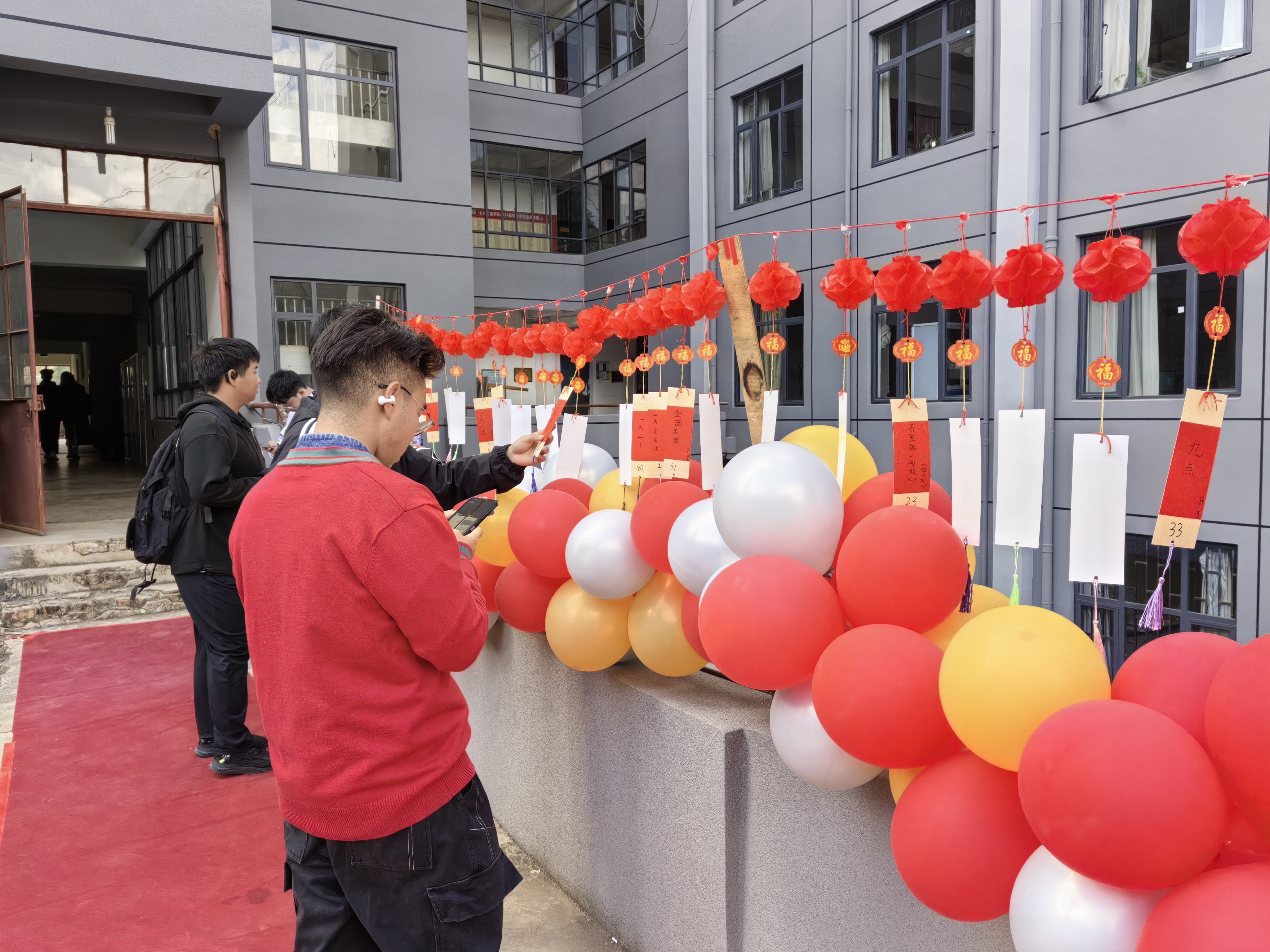 活动在第一议题:学习《国家主席习近平发表二〇二四年新年贺词》的学习后开启。游园活动包含猜灯谜、写福字、剪窗花、投壶、放飞纸飞机、贴鼻子、手脚并用等活动。活动让远在他乡的同学们体会了温暖、感受了剪窗花和写福字传统活动的乐趣,互动游戏环节拉近了同志们间的距离,增进了团队凝聚力。