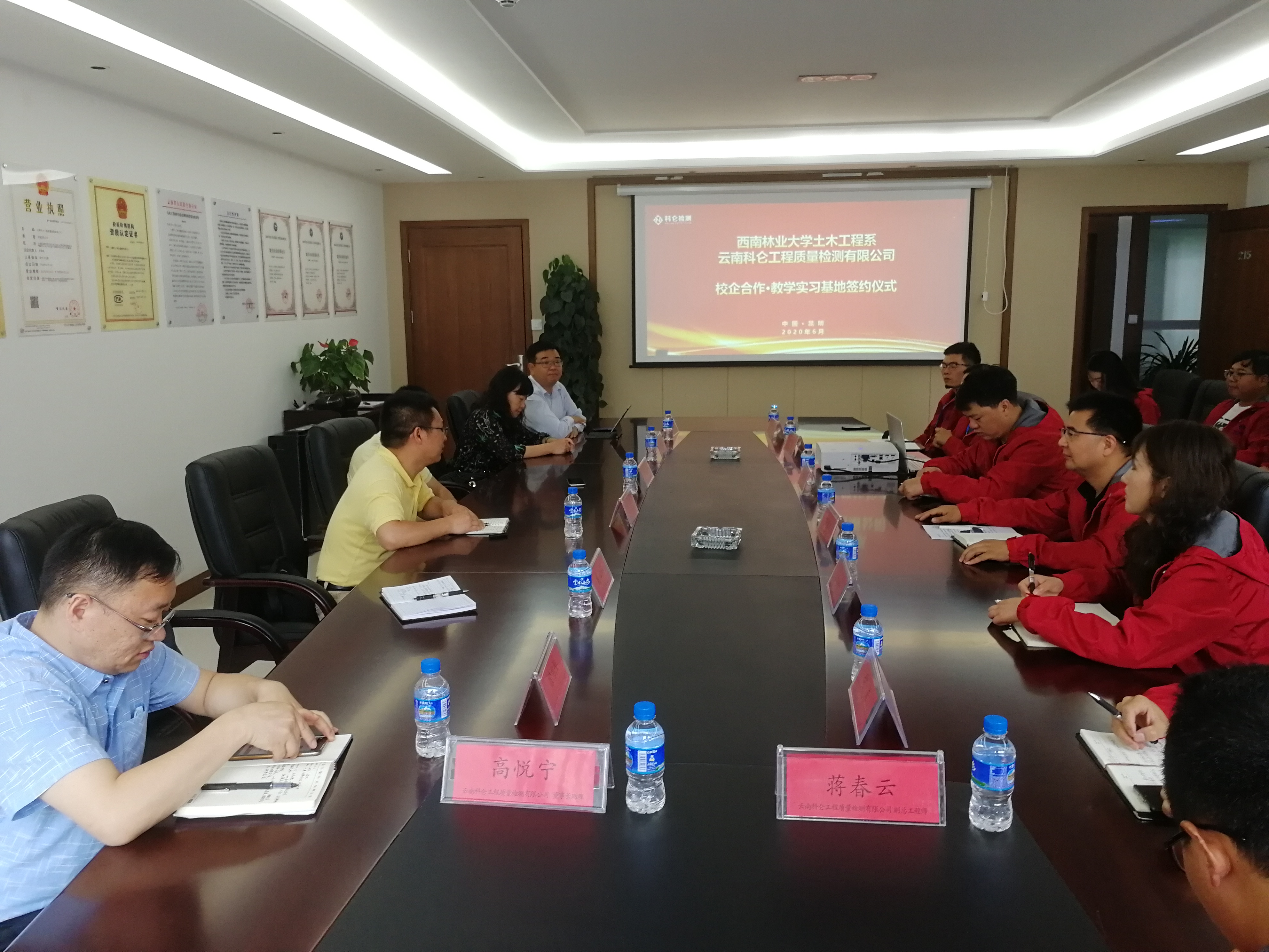2020年6月18日上午,公司王秋华副经理带领土木工程系、森林工程系部分教师前往云南科仑工程质量检测有限公司就校外实习基地建设开展实地参观、座谈交流、协议签订及实习基地挂牌等活动。